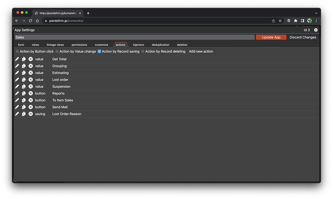 In addition, record data transfer between apps and PDF output can be realized with simple settings, and it is also possible to change the contents of the record according to the conditions of the record with rich Functions.