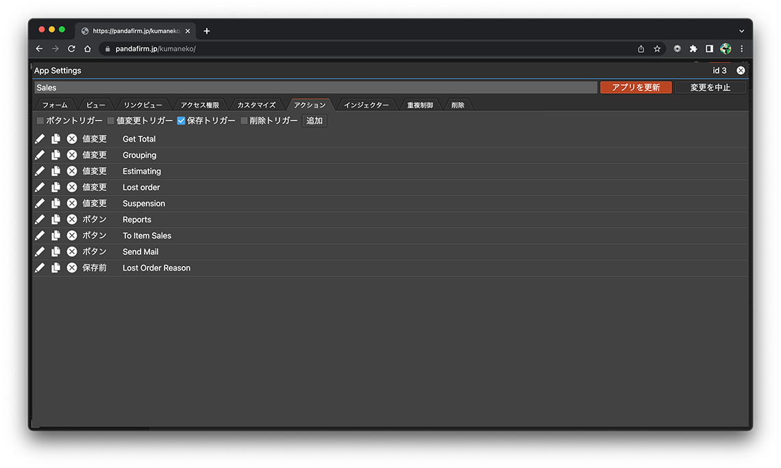PDF出力 アプリ間のレコードコピー/更新 メール送信 |
